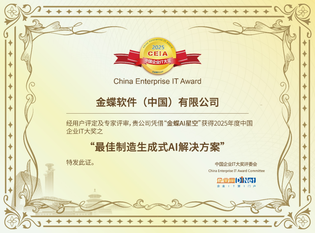 由政企市场专业媒体企业网D1net、信众智和中国企业数字化联盟联合主办的“2025 CEIA中国企业IT大奖”重磅揭晓。经过严格筛选和专业评估,金蝶凭借“金蝶AI星空”获评“最佳制造生成式AI解决方案”奖。